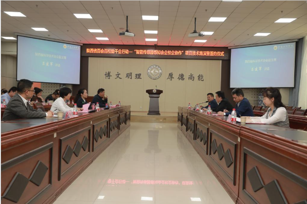 在全省上下深入学习贯彻党的二十大精神和习近平总书记来陕考察重要讲话重要指示精神,公司喜迎建校65周年、开展学习贯彻习近平新时代中国特色社会主义思想主题教育之际,4月20日下午,公司在高新校区甘棠厅举办了陕西省百会百校助千企行动——“智能传感器感知会企校企协作”项目技术路演暨签约仪式。副董事长李景宜,陕西省科协党组成员、副主席吕建军出席活动。仪式由校科协秘书长、科研管理处处长王晓玲主持。