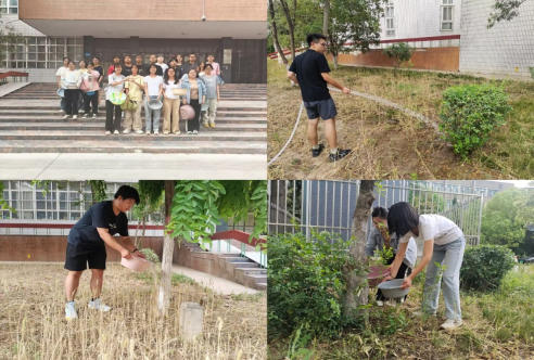 烈日下,同学们迅速投入到紧张而有序的抗旱浇树工作中。每一位同学都全神贯注,仔细浇水灌溉每一株绿植,有的同学顶着酷暑反复往返取水,有的同学耐心排查角落绿植缺水情况,汗水湿透衣衫却毫不停歇,确保每一滴水都能精准地滋润到植物的根部,为绿植送去生命之水。在大家的默契配合下,完成了图书馆周边树木的浇水工作,用自己的实际行动为建设美丽校园贡献力量。